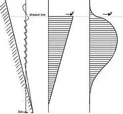 Bij een brandingsstroom is die schuifspanning veel groter. Dat komt omdat er onder de golven ook een snelheid is, de orbitaalsnelheid. De orbitaalsnelheid van golven aan de bodem is min-of-meer symmetrisch, en geeft dus geen resulterende snelheid, maar wel schuifspanning. De combinatie van brandingsstroom en orbitaalsnelheid geeft dus extra schuifspanning, en daardoor een vergroot oppikvermogen van de stroom voor sediment. En dus kan eenzelfde stroomsnelheid door de invloed van golven veel meer sediment transporteren.