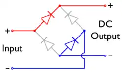 De diodes zijn zo geschakeld dat een wisselspanning aan de ingangsklemmen altijd een gelijkspanning aan de uitgang levert. De stroom loopt in de afbeeldingen door de rode en blauwe diodes, terwijl de grijze diodes zijn gesperd.