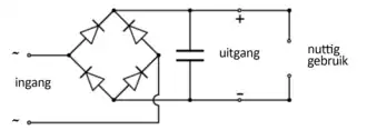 De onbelaste uitgangsspanning van een bruggelijkrichter is bij een sinusvormige ingangsspanning ongeveer 1,4 maal de effectieve waarde van de ingangsspanning. De piekspanning van een sinus is namelijk maal de effectieve waarde. Van de uitgangsspanning moet 2 x 0,7 = 1,4 volt worden afgetrokken bij gebruik van siliciumdiodes, vanwege de spanningsval over de twee diodes waar de stroom doorheen gaat.