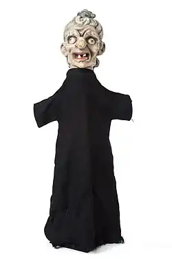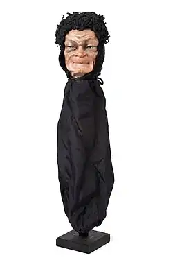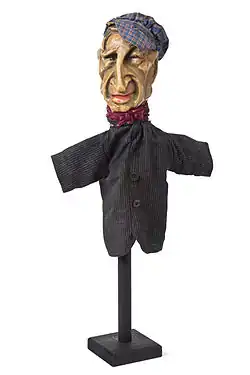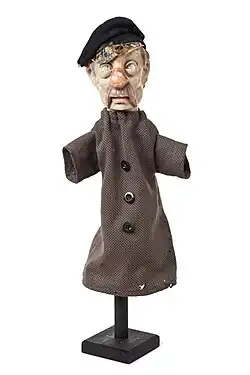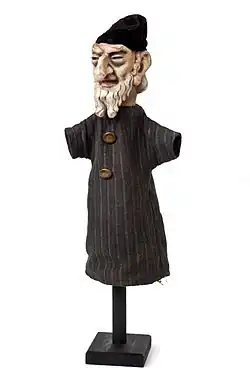 Deze pop is het toonbeeld van de jood tijdens het interbellum. De pop beantwoordt aan het stereotiepe beeld van een Oost–Europese Jood die er in die tijd heerste: een grote haakneus, een lange baard, een lange zwarte jas en een zwarte muts. Hij wordt vaak als gierig bestempeld en heeft een opvliegend karakter. Deze negatieve visie van een Jood geeft duidelijk blijk van de antisemitische ingesteldheid die deel uitmaakte van het maatschappelijke leven. |