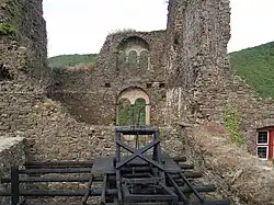 Vanaf het midden van de 13e eeuw waren de aartsbisdommen van Keulen en Trier gezamenlijk eigenaar van het complex. De bisdommen lieten hun aandeel in de burcht elk door burchtgraven besturen. Elke helft bezat derhalve een eigen bergfried, eigen woon- en bedrijfsgebouwen en een eigen aparte toegang. Sinds het begin van de 16e eeuw trad een geleidelijk verval van de dubbelburcht in. De verwoestingen tijdens de Paltse Successieoorlog degradeerden het complex verder tot een ruïne.