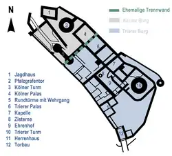 Vroeger was de Keulse helft slechts over een smalle houten brug door de Paltsgravenpoort aan de noordwestelijke hoek van het complex te bereiken. De poort sluit zich aan een binnenhof aan, waaraan op het zuidoostelijke einde twee ronde torens staan die door een overdekte weergang met elkaar worden verbonden. In de zuidelijke toren bleven muurschilderingen bewaard, die de wapens van alle bezitters en leenheren tonen. Boven de toenmalige grensmuur met de Trierse helft is de zuidelijke toren met de ruïne van het Keulse palas uit de 16e eeuw aan de oostelijke zijde van het complex verbonden. Vroeger bevond zich hier de ridderzaal, maar de bouw werd in 1812-1813 door de troepen van Napoleon verwoest, zodat tegenwoordig nog slechts naast de kelder de begane grond volledig bewaard bleef. Van de hogere verdiepingen bleven naast de gevelmuren ook de noordoostelijke buitenmuur bewaard. Ze bezit vensters in de laatromaanse stijl, die echter niet oorspronkelijk zijn en pas in het begin van de 20e eeuw werden ingebracht.