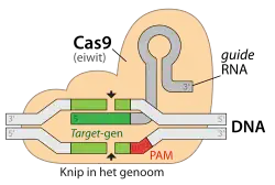 CRISPR/Cas werkt als een moleculaire schaar, die heel precies een bepaalde plek in het genetisch materiaal doorknipt en wijzigt. De naam CRISPR staat voor clustered regularly interspaced short palindromic repeats; dit zijn herhalende DNA-sequenties die voorkomen in bacteriën. Cas, een afkorting van CRISPR-associated protein, is het eiwit dat daadwerkelijk de knip in het DNA maakt. CRISPR/Cas vormt een natuurlijk verdedigingssysteem in bacteriën en archaea, die dit systeem gebruiken om genetisch materiaal van binnendringende virussen te vernietigen. Het herkenningsvermogen van CRISPR/Cas is zo precies, dat onderzoekers dit systeem hebben aangewend voor genetische modificatie.[1][2]
