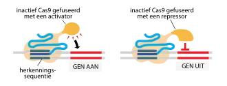 Het is bijvoorbeeld mogelijk om een (katalytisch inactief) Cas9-eiwit te fuseren met een transcriptionele activator of repressor, en dit naar een gewenst gen te richten door het guide-RNA overeen te laten komen met de promotorregio van het gen van interesse. De activator en repressor kan vervolgens de expressie van dit gen reguleren.[3]