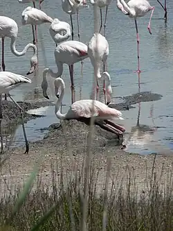 Het embleem van de Camargue is de flamingo (Phoenicopterus roseus). Het gebied is de enige plek in Frankrijk en een van de weinige plaatsen rond de Middellandse Zee waar ze te vinden zijn. Het aantal wordt geschat op maximaal 20.000 paartjes; ze leven verspreid in groepen en staan onder bescherming. Plankton, dat ze met hun bek uit het water kunnen zeven, is hun voornaamste voedselbron. De flamingo's gebruiken modder om nesten te bouwen.