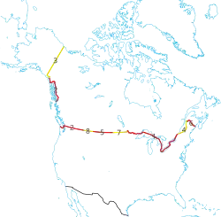 De totale lengte van de landsgrens tussen Canada en de Verenigde Staten is 8.891 kilometer, inclusief watermassa's. De grens tussen Alaska en Canada is 2.475 kilometer lang. Acht van de dertien provincies en territoria van Canada en dertien van de vijftig Amerikaanse staten liggen aan deze landsgrens.[24][25]
