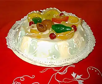 Deze bestaat uit cake met gezoete ricotta en marsepein met bovenop gekonfijt fruit en slagroom.