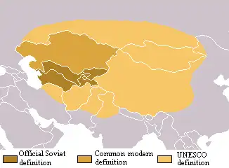 UNESCO schreef vlak voor de instorting van de Sovjet-Unie een boek over de algemene geschiedenis van Centraal-Azië, waarbij de regio werd gedefinieerd op basis van klimaat en kwam zo tot een veel ruimere afgrenzing. Volgens deze definitie omvat Centraal-Azië ook Mongolië, westelijk China (inclusief Tibet), noordelijk India (de deelstaten Himachal Pradesh, Jammu en Kasjmir en Punjab), het noordoosten van Iran (Golestan, Noord-Khorasan en Razavi-Khorasan), Afghanistan, noordelijk Pakistan (de provincies Punjab, Noordelijke Gebieden en Khyber-Pakhtunkhwa), het centrale deel van het oosten van Rusland ten zuiden van de taiga en de vijf Centraal-Aziatische sovjetrepublieken. Het gebied kan worden gedefinieerd op basis van etniciteit, waarbij wordt gekeken naar de gebieden die worden bewoond door Oost-Turkse, Oost-Iraanse of Mongoolse volkeren. Deze gebieden omvatten Sinkiang, de Turkse/islamitische regio's van Zuid-Siberië, de vijf republieken en Afghaans Turkestan, noordelijk Pakistan en de Afghanen en Tibetanen. Deze genoemde volkeren worden gezien als de "inheemse" volkeren van het uitgestrekte gebied.
