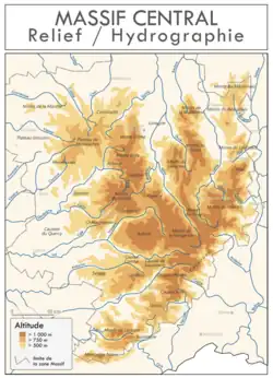 De waterscheiding tussen de Atlantische Oceaan en de Middellandse Zee loopt door de oostelijke en zuidelijke delen van het Centraal Massief en passeert onder meer volgende passen en bergen: