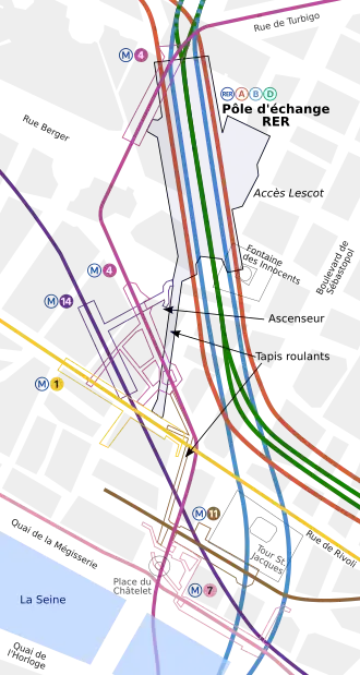 Metrostation Châtelet is verbonden met het RER-station Châtelet - Les Halles, waar de RER-lijnen A, B en D halteren. Tevens is er een ondergrondse verbinding met metrostation Les Halles.