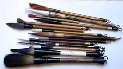 Traditioneel schildert men in China met zwarte Oost-Indische inkt, die wordt verkregen door een inktstaaf op een vochtige inktsteen te schuren. De inkt bestaat uit roet en beenderlijm en is lichtecht, zodat de schildering eeuwenlang goed blijft. De schilder gebruikt penselen van allerlei afmetingen en vormen. Deze zijn gewoonlijk gemaakt van dierenhaar gevat in een bamboeschacht. De inkt wordt aangebracht op washi-papier of zijde, twee absorberende materialen die weinig tot geen correctie toelaten. Schilderen in inkt vereist daarom een grote vaardigheid en concentratie. Kunstschilders oefenen elke penseeltechniek tot ze genoeg routine hebben ontwikkeld. De druk, vorm en richting van het penseel bepalen de breedte en vorm van de lijn. Het dynamische karakter van de penseelvoering is voor veel kunstenaars het grootste aandachtspunt.[3] Veel penseeltechnieken hebben in de loop der tijd een eigen naam gekregen.