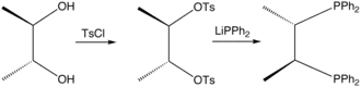 De benadering van een chirale synthese via makkelijk en goedkoop beschikbare enantiomeer zuivere uitgangsstoffen wordt aangeduid met de Engelse term chiral pool-synthese. Het diol wordt getosyleerd met p-tolueensulfonylchloride, waarna het ditosylaat met lithiumdifenylfosfide tot chirafos wordt omgezet.[2] De reactie van het difenylfosfide met het ditosylaat is een SN2-reactie, die op beide chirale centra met inversie van configuratie verloopt.