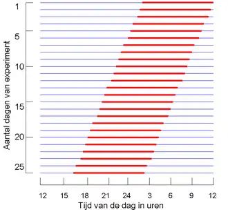 In omstandigheden waar kunstmatig de omgeving altijd licht of donker wordt gehouden, blijft het circadiane ritme gehandhaafd. Hierbij ontbreekt dus tijdaanduiding van de omgeving (ook wel Zeitgeber) genoemd en gaat het endogene (eigen) ritme overheersen. Het ritme voor nachtdieren is bijvoorbeeld in een altijd donkere omgeving iets korter dan 24 uur, waardoor het over opeenvolgende dagen steeds iets naar voren schuift in de tijd (zie illustratie).[4]