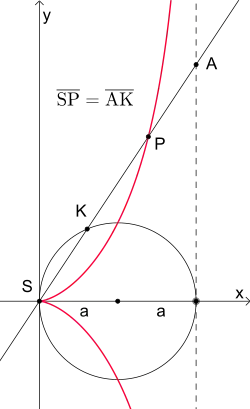- De cissoïde kan meetkundig als volgt worden beschreven. Gegeven een cirkel met straal , een punt daarop en de raaklijn in het punt tegenover . Noem voor een punt van de cissoïde het snijpunt van met de cirkel , en het snijpunt met de genoemde raaklijn . Dan zijn de lijnstukken en even lang.