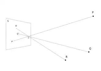 Lichtstralen vallen door de opening van een camera obscuraDe punten en worden geprojecteerd op het beeldvlak via het projectiecentrum - en -as bij de projectie van via het projectiecentrum