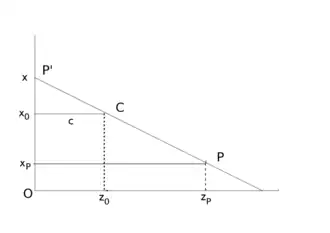 Laat een coördinatensysteem zijn met de - en -as in het beeldvlak. Het punt wordt door centrale projectie op het beeldvlak afgebeeld. Het af te beelden punt heeft in dit systeem de coördinaten , het beeld van de coördinaten en , en het projectiecentrum de coördinaten . Bij centrale projectie is er eenzelfde verhouding tussen de overeenkomende driehoekszijden