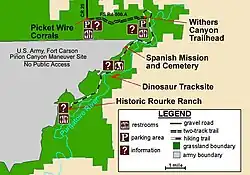 Picketwire Canyon is ongeveer 120 meter diep en bevat de Purgatoire River-sporenlocatie, een van de grootste dinosauruspoortrajecten ter wereld, in de Morrison-formatie. Meer dan 1300 sporen van Brontosaurussen en Allosaurussen van 150 miljoen jaar oud zijn bewaard gebleven in de rotsen. De canyon en de dinosaurusvoetafdrukken zijn bereikbaar via een wandel-, fiets- en ruiterpad dat 14,0 km enkele reis door de canyon loopt naar de Dolores Mission, de ruïnes van een kleine 19e-eeuwse katholieke kerk, de dinosaurusvoetafdrukken en de adobe-gebouwen van de Rourke-ranch, die tussen 1871 en 1971 in bedrijf was en bewaard is gebleven als National Historic Site. Het pad is normaal gesproken gesloten voor gemotoriseerde voertuigen. In het weekend in de herfst en lente leiden rangers rondleidingen door de canyon in vierwielaangedreven voertuigen, waarbij bezoekers hun eigen voertuigen meenemen.