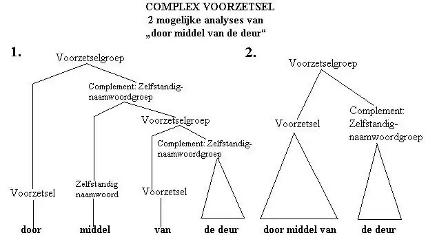 De transformationalistische taalkunde werkt met woordgroepen, hetgeen vereist dat de samenstelling van een zin uit een vertakking van verschillende frasen bestaat. Op die wijze valt elke groep in haar componenten uiteen: DOOR + MIDDEL + VAN + DE DEUR is zodoende een voorzetselgroep die, zoals elke voorzetselgroep, een voorzetsel en een complement omvat. Dit complement, MIDDEL VAN DE DEUR, vormt op zich een zelfstandig-naamwoordgroep: het hoofd van de groep, het zelfstandig naamwoord MIDDEL, bezit een bijkomende modificatie in de vorm van de voorzetselgroep VAN DE DEUR. Deze groep, op haar beurt, vormt opnieuw een voorzetsel en een complement, waarbij DE DEUR de zelfstandig-naamwoordgroep is die het complement van deze groep uitmaakt. De analyse luidt derhalve: