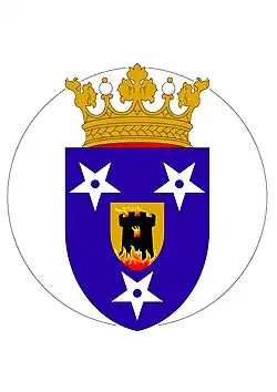 Van azuur, met een schildje van goud, beladen met een toren van sabel, gekanteeld van twee stukken en twee halve, geopend en verlicht van keel, uitkomende van een vuur van natuurlijke kleur, uitgaande van 't schildeinde, het schildje vergezeld van drie spoorraden met vijf stralen van zilver. Het schild overtopt met een helm van zilver, gekroond, getralied, gehalsband en omboord van goud, gevoerd en gehecht van keel, met dekkleden van azuur en van goud. Helmteken: de toren en het vuur van het schild. Wapenspreuk: Ambulate in dilectione van goud, op een lossen band van azuur.