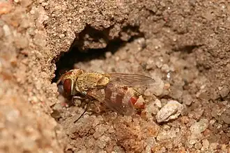 De vliegen zijn zandgekleurd wat hen goede camouflage biedt.