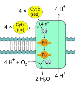 4 Cytc(Fe2+) + O2 + 8 H+binnen → 4 Cytc(Fe3+) + 2 H2O + 4 H+buiten