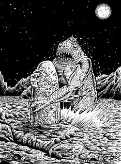 Na twee dagen bereikt hij een kloof, met daarin een groot wit voorwerp dat bij nader onderzoek een enorme monoliet blijkt te zijn die overduidelijk door iets of iemand gemaakt moet zijn. Op de monoliet staan voor de verteller onbekende hiërogliefen die grotendeels zeewezens uitbeelden. Verder staan er beeltenissen op van vreemde mens/vis-hybriden.