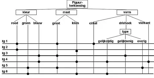 Nadat de koppen van een boom zijn gemaakt, kan de boom ingevuld worden. Vooraf moet bepaald worden welke factoren volledig getest moeten worden. In deze boom moet de maat met de kleur volledig worden gedekt door de boom. Dit wordt vertaald naar de boom hier rechts.