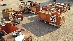 De autorenbaan is te huur voor een evenement. Het is een bonte verzameling racewagentjes op kindermaat, gemaakt van oude meubels. Een parcours is met autobanden afgebakend.