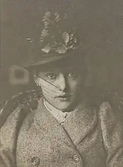 Centraal op de voorgrond staat een modieus geklede vrouw, gekleed volgens de laatste Parijse mode, in een met bontstroken afgezette oranjebruine pelerine, die blijkbaar inkopen heeft gedaan bij het modehuis Hirsch & Cie. Voor haar gezicht draagt ze een voile, strak getrokken om een hoed van hanenveren. De vrouw lijkt recht op de toeschouwer af te lopen, deze bijna het idee gevend aan de kant te moeten stappen. Het beeld wordt beneden echter bruusk afgesneden, hetgeen illustreert hoe Breitner vaak fotografische opnames gebruikte voor zijn schilderwerken.