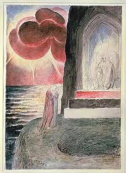 • William Blake, 1824-1827.[87] In opdracht van John Linnell begon Blake aan de illustratie van de Komedie in 1824. Bij zijn dood in 1827 bleef een gedeelte van de tekeningen onafgewerkt achter, andere waren al uitgewerkt tot aquarel.