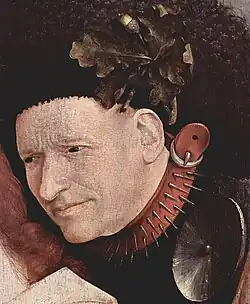 De hond draagt een stekel- of spijkerhalsband. De Oostenrijkse volkenkundige Leopold Schmidt heeft aangetoond dat het gebruik hiervan in de middeleeuwen wijdverbreid was. Spijkerhalsbanden werden gebruikt voor jachthonden, om deze te beschermen voor beten van wilde dieren, maar ook voor waakhonden, om deze te beschermen voor elkaar.[7] Op het eveneens aan Bosch toegeschreven schilderij De doornenkroning in de National Gallery in Londen draagt een van de beulen van Jezus overigens ook een spijkerhalsband, die mogelijk verwijst naar de Bijbelpassage:
