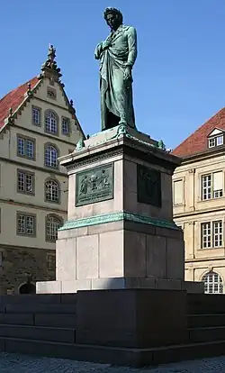 In de Duitse streek Württemberg ligt het stadje Marbach. Het ligt aan de Neckar en er hangt wijnloof, de donkere dagen komen. Een moeder in barensweeën hoort de kerkklokken. Het is een feestdag en de moeder brengt een zoon ter wereld. Het kind heeft heldere ogen en vergulde haren. Op tien november 1759 schenkt God een zoon, schrijft het gezin in de bijbel. Bij de doop krijgt het kind de namen Johan Christoph Friedrich. Het gezin verhuist naar een andere stad en als het jongetje zes is kent hij vrome psalmen. Zijn vader leest voor uit Gellerts Fabels en uit de Messias. Hij heeft een zusje dat twee jaar jonger is en ze horen over de kruisdood tot verlossing van alle mensen. Als het gezin terugkomt in Marbach, zijn er nieuwe graven op het kerkhof en de klok is in het gras gevallen. Er is een nieuwe klok en de moeder vertelt hoe de oude klok eeuwenlang dienst heeft gedaan. Tijdens de doop, bruiloften en begrafenissen en verschrikkingen van het vuur. De moeder vertelt over haar bevalling en de jongen kust de klok. De jongen wordt aangenomen op de militaire school en hij krijgt laarzen en een stropdas en poederpruik. De klok zou misschien omgesmolten worden, misschien wordt het ooit een pen. De landsheer geeft een feest en een man probeert weg te gaan van zijn vaderland. In een bos bezit hij niet meer dan een paar beschreven bladen over Fiesko en vluchtelingen overnachten in een herberg. De kerkklok wordt verkocht als oud koper en wordt in Beieren omgesmolten als gedenkteken voor een man die het Duitse volk vereert. In Denemarken groeien beuken en staan hunebedden en er woont een arme jongen. Een vader snoeit op Holm en krijgt eten van zijn zoon. De zoon beitelt schone gestalten in marmer en krijgt opdracht een gestalte te boetseren van Johann Christoph Friedrich. Het erts van de oude kerkklok vloeit en vormt het hoofd en borst van het beeld dat nu in Stuttgart staat voor het slot op het plein. De vluchteling werd een onsterfelijk dichter en hij zong over de bevrijder van Zwitserland en Frankrijk door God bezielde jonkvrouw. Honderd jaar na het luiden van de kerkklok tijdens de bevalling, luiden opnieuw klokken voor de dichter van het vrouwenhart.