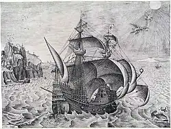 Het schip is een toevoeging van Bruegel. De zeelui die druk doende zijn benadrukken nogmaals het onopgemerkte drama. De ruïne op het rotseiland lijkt het Paleis van Minos voor te stellen, waaruit Daedalus en Icarus waren ontsnapt. In de voorgrond ligt een zak tegen een rots, wellicht met zaaigoed. Men heeft er een verwijzing in gezien naar de Gelijkenis van de zaaier, waarmee Bruegel de onvruchtbare ambitie van Icarus vergelijkt.
