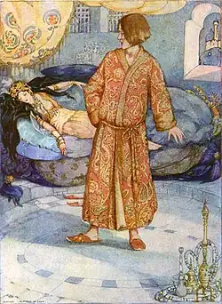 Een rijke koopman krijgt een daalder voor elke stuiver die hij uitgeeft, zijn zoon erft het geld. Hij gaat naar gemaskerde bals en maakt vliegers van bankbiljetten. Hij houdt slechts tien stuivers over en zijn vrienden kijken niet meer naar hem om. De jongen bezit slechts zijn pantoffels en kamerjas. Van de trouwste vriend krijgt hij een koffer en omdat hij niets bezit, gaat hij er zelf in zitten. De jongen vliegt door de schoorsteen en komt in het land van de Turken terecht. Hier valt hij niet op, iedereen loopt in kamerjas en pantoffels.
