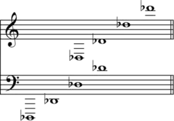 Musicologische notatie Helmholtznotatie Octaafnaam Frequentie (Hz) D♭-1 D♭,,, Subsubcontra-octaaf 8.662 D♭0 D♭,, Subcontra-octaaf 17.324 D♭1 D♭, Contra-octaaf 34.648 D♭2 D♭ Groot octaaf 69.296 D♭3 d♭ Klein octaaf 138.591 D♭4 d♭′ Eengestreept octaaf 277.183 D♭5 d♭′′ Tweegestreept octaaf 554.365 D♭6 d♭′′′ Driegestreept octaaf 1108.731 D♭7 d♭′′′′ Viergestreept octaaf 2217.461 D♭8 d♭′′′′′ Vijfgestreept octaaf 4434.922 D♭9 d♭′′′′′′ Zesgestreept octaaf 8869.844