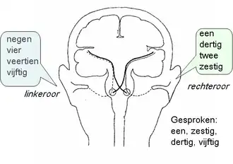 Een andere versie van de dichotische luistertaak is gebruikt in onderzoek naar hemisferische specialisatie. Deze taak is bedacht door de neuropsycholoog Doreen Kimura. Hierbij worden wederom aan beide oren door een koptelefoon in hoog tempo woorden, zoals gesproken cijfers, aangeboden. In 2 seconden tijd worden bijvoorbeeld na elkaar 4 woorden op het rechteroor, en 4 woorden op het linkeroor gepresenteerd. De opdracht daarbij luidt zo veel mogelijk woorden te herhalen die men in de voorafgaande aanbieding heeft gehoord. Het blijkt nu dat de meeste proefpersonen meer woorden correct rapporteren die op het rechter- dan linkeroor worden aangeboden, Dit verschijnsel heet ook wel rechteroor-voordeel (Engels: Right Ear Advantage). Dit is mede een gevolg van het feit dat de auditieve zenuwbanen van het oor naar de contralaterale (tegenovergestelde) hersenhelft sterker ontwikkeld zijn, dan de ipsilaterale banen (banen die gaan naar de hersenhelft aan dezelfde kant als het oor). Dit betekent o.a. dat woorden die rechts worden aangeboden ook een sterker effect hebben op de linker- dan rechterhersenhelft. Het rechteroor-voordeel valt dan te verklaren als een gevolg van het feit dat de linkerhersenhelft beter is in het verwerken van verbale (taalachtige) stimuli zoals woorden, dan de rechterhersenhelft. Kimura vond ook dat bij aanbieding van korte muziekfragmenten een linkeroor-voordeel optrad: kennelijk was de rechterhersenhelft superieur in het herkennen/onthouden van muziek. Overigens blijken deze effecten niet bij alle proefpersonen op te treden, en zijn de verschillen in accuratesse tussen rechter- en linkeroor doorgaans vrij klein.