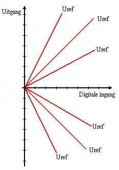 - kwadrant linksonder: negatief binair getal negatieve referentiewaarde = negatieve uitgangsspanning