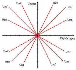 Op de grafiek links is te zien hoeveel de uitgangspanning (x-as) zal bedragen bij een bepaalde ingang (y-as) met een bepaalde analoge referentiewaarde (enkele mogelijkheden voorgesteld door de rode lijnen, referentie waarde kan alle analoge waarden aannemen, dus er zijn oneindig vele rode lijnen mogelijk).