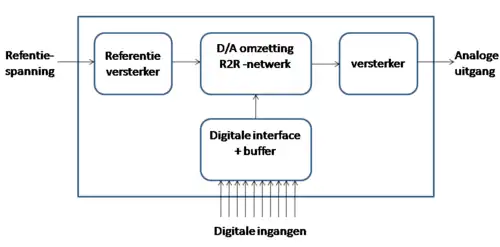 In volgende afbeelding worden de basisblokken van de DAC weergegeven. Niet alle delen zijn noodzakelijk aanwezig in een DAC, maar meestal vormen deze wel de basis.