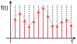 De tijdsbasis van de bemonstering in de bovenste afbeelding toont zes monsters (verticale pijlen) binnen een sinus van het ingangssignaal. Bij elk monster wordt de amplitude van het ingangssignaal onthouden tot het volgende monster.