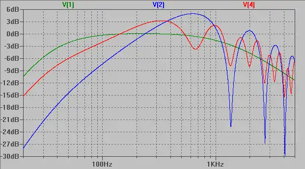 In onderstaande grafiek staat in het groen de frequentierespons van een typische 10 inch (ca. 25cm) woofer in een zeer groot klankbord geplot, in het blauw dezelfde woofer in een klein paneel, waar het signaal van de achterkant interfereert met het signaal aan de voorkant met een weglengte-verschil van ca. 25 cm.