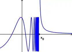 - In is er nu een essentiële discontinuïteit: de linkerlimiet bestaat niet en de rechterlimiet is oneindig. Merk op dat een van beide volstond om te kunnen spreken van een essentiële discontinuïteit.