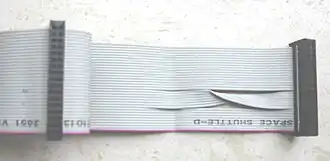 Deel van een diskettekabel, met tussen de connectors een slag in de kabel