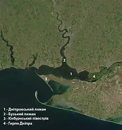 - Dit artikel of een eerdere versie ervan is een (gedeeltelijke) vertaling van het artikel Dnieper-Bug Estuary op de Engelstalige Wikipedia, dat onder de licentie Creative Commons Naamsvermelding/Gelijk delen valt. Zie de bewerkingsgeschiedenis aldaar.