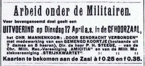 Onder leiding van dirigent Piet Steege gingen de 30 zangers van DEV van start. Niet meer gesteund door subsidie van de Werkmansbond werd de contributie verhoogd van 8 tot 12 cent per week. De eerste repetities in het 'Christelijk Koffiehuis' -later hotel 'De Steur'- aan de Oudestraat, waren ter voorbereiding van een uitvoering op 17 april 1917 ten bate van "de Arbeid onder de Militairen" in 'Het College', wat later hotel 'De Hanzestad' was, naast het oude postkantoor. Het repertoire was nog te kort voor een avondvullend programma. Zoals vaker in die tijd gaf men na de pauze een 'samenspraak'; men reciteerde een blijspel, bijvoorbeeld 'Mijn Haan Zal Koning Kraaien'...