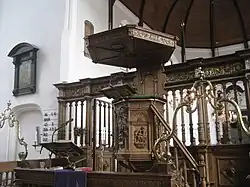 Rond de preekstoel staat een zeventiende-eeuwse doophek met twee koperen doopbogen, een lezenaar en kandelaars.