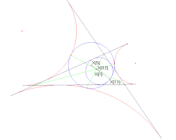 De raakpunten van de negenpuntscirkel en de aangeschreven cirkels vormen een driehoek die de driehoek van Feuerbach wordt genoemd. De driehoek is gelijkvormig aan en perspectief met de ceva-driehoek van X(1). Het perspectiviteitscentrum is het punt van Feuerbach X(11).