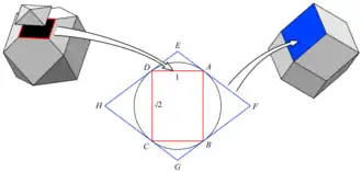 De zijde van de rombische dodecaëder, de duale vorm van de kuboctaëder, wordt als volgt geconstrueerd.