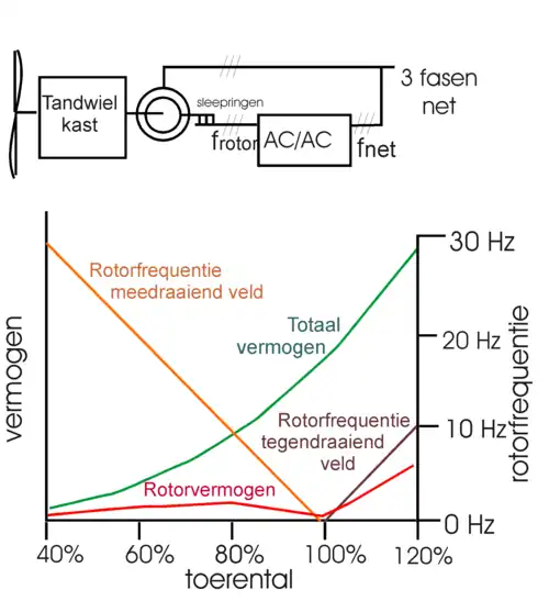 Bij toerentallen boven het synchrone toerental draait het veld in de rotor tegen dat van de stator in, gezien vanuit de rotor. Dit betekent dat de rotor ook vermogen gaat leveren. Het totaal geleverde is nu de som van het door stator en rotor geleverde vermogen. Bij bijvoorbeeld een toerental dat het dubbele is van het synchrone toerental, leveren stator en rotor evenveel vermogen.