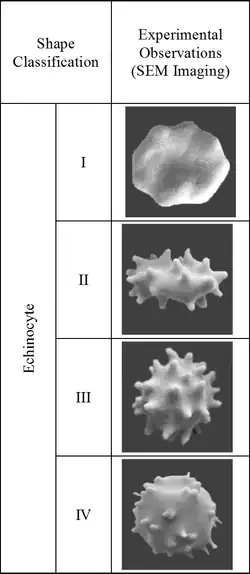 De normale biconcave vorm van een rode bloedcel kan worden gewijzigd in stomatocyten en echinocyten. Stomatocyten- en echinocytenvormen worden verder gecategoriseerd in subklassen I, II, III en IV, rekening houdend met verschillende stadia van concaviteit en karteling. De nomenclatuur van Bessis wordt algemeen gebruikt om verschillende rode bloedcelvormen te identificeren.[1] De verschillende stadia van een echinocyt kunnen als volgt worden omschreven: